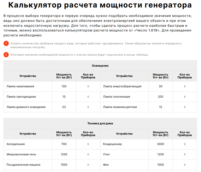 3. Калькулятор расчета мощности генератора